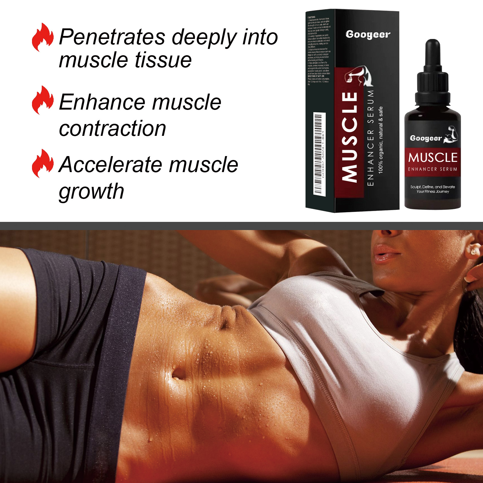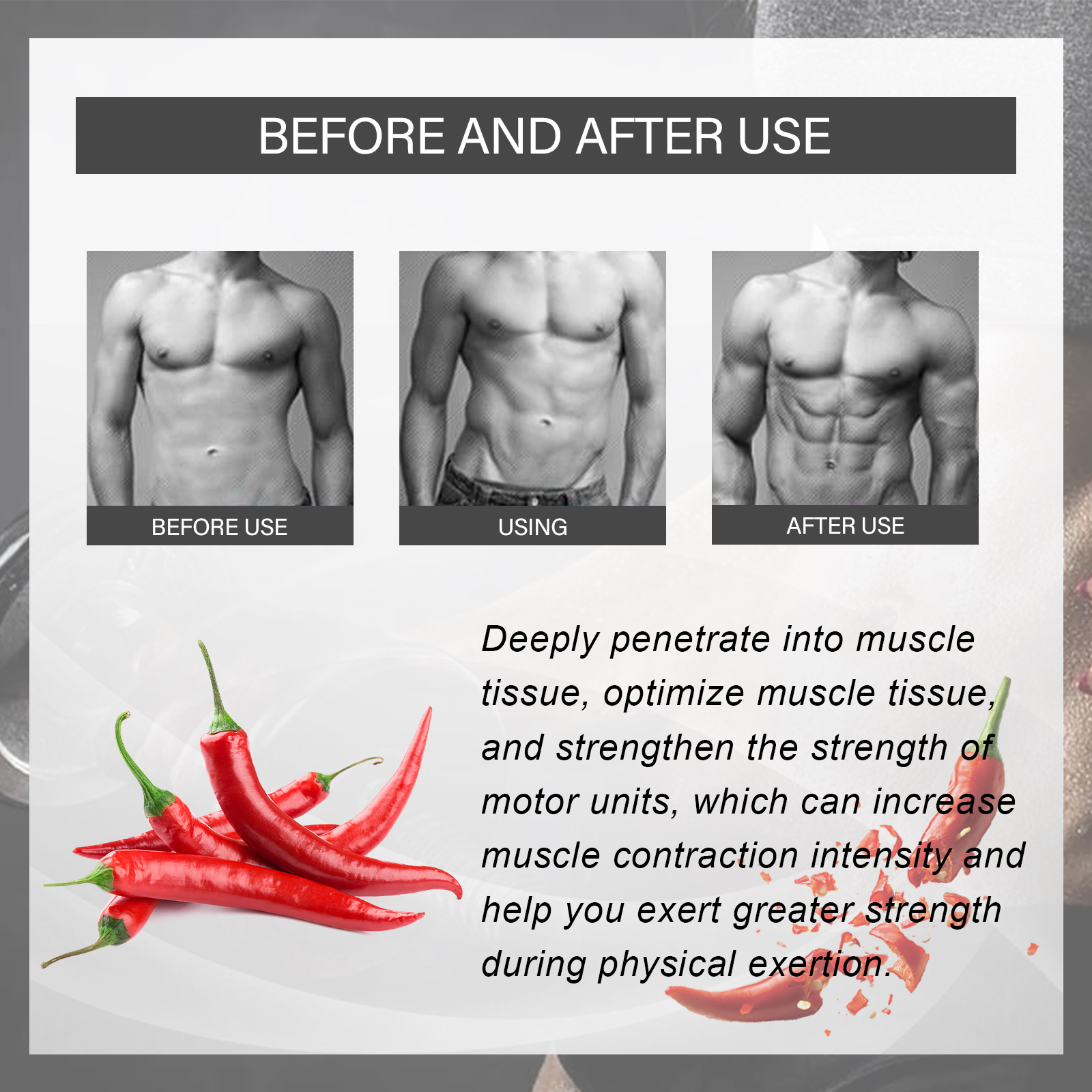 Our muscle enhancers contain cayenne pepper extract, buckeye extract, and B vitamins. It can penetrate deeply into the muscle tissue, optimize the muscle tissue, enhance the strength of the motor unit, increase the strength of the muscle contraction, and help you exert more power when you exercise. The way to use it is very simple: shake it well before eating, 1-2 drops each time, 1-2 times a day. And a variety of ingredients can quickly release calcium ions within muscle cells, enhancing muscle contraction and overall strength production, making exercise more effective.