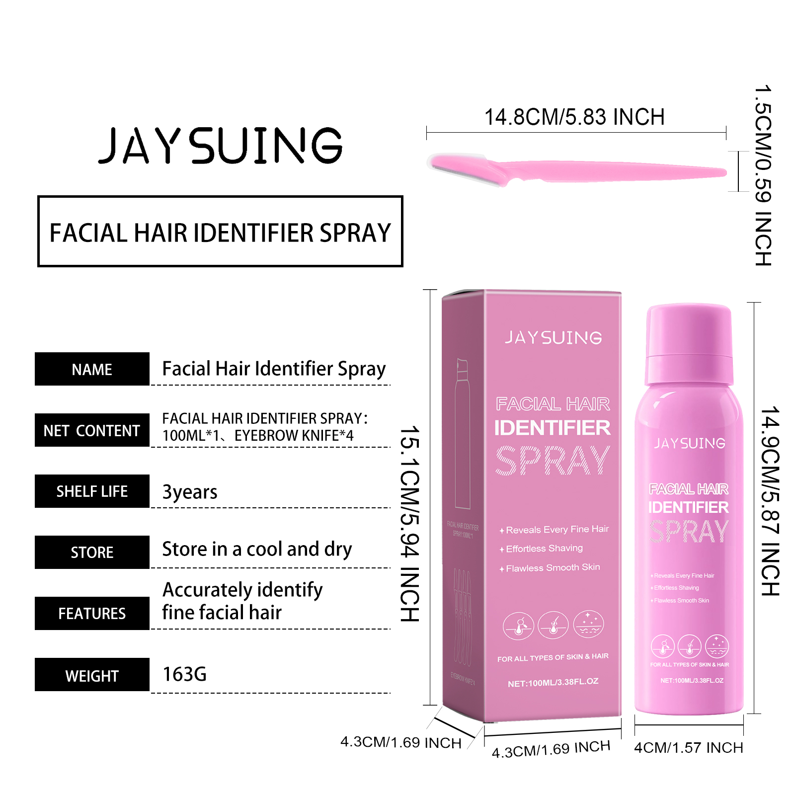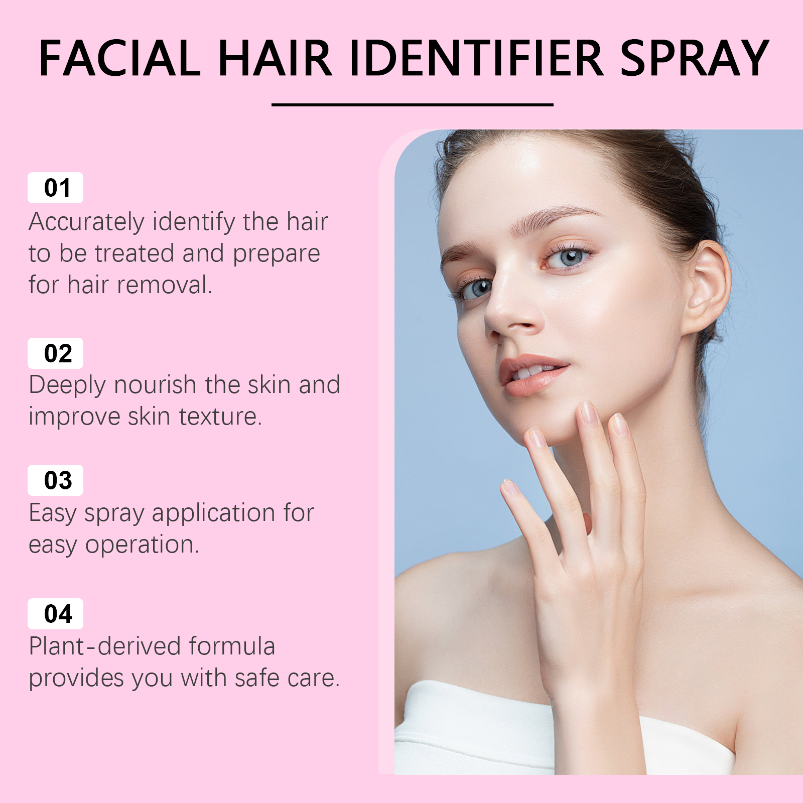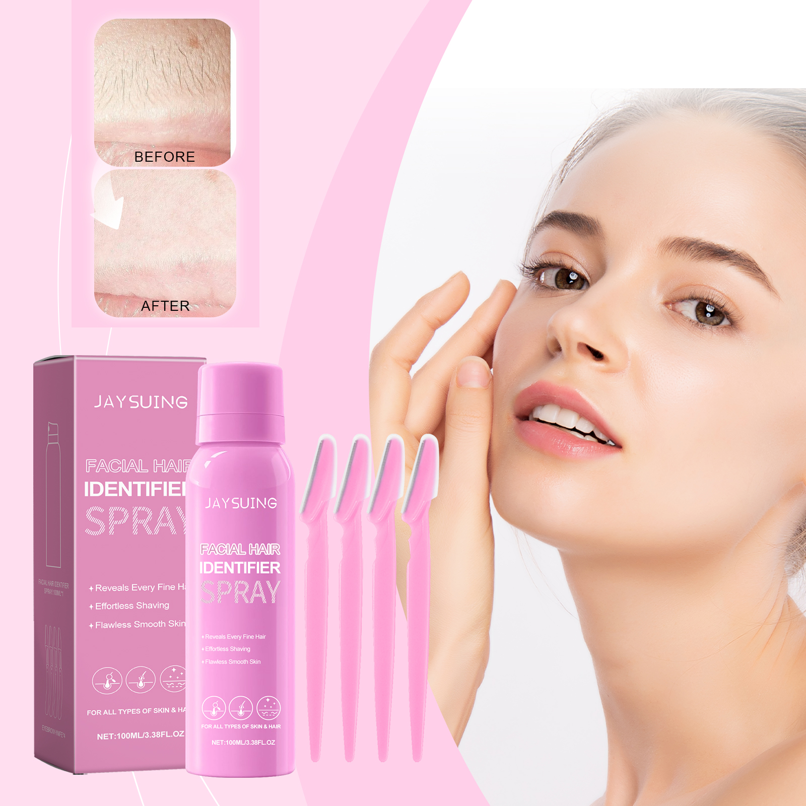 Our facial hair recognition spray contains Hu root extract and cap root extract. It can accurately identify facial signature hair and process it in preparation for hair removal. The plant essence deeply moisturizes the skin and keeps the skin hydrated. Improves skin texture. Its application method is simple: 1. Completely clean and dry facial skin; 2. Take appropriate amount of this product and spray evenly on the parts that need hair removal. 3. Use an eyebrow knife to gently shave off the hair you want to repair. Regular use can improve skin texture and make skin more delicate and smooth.